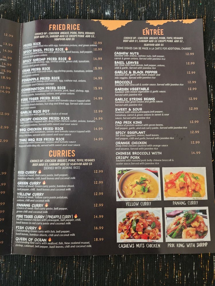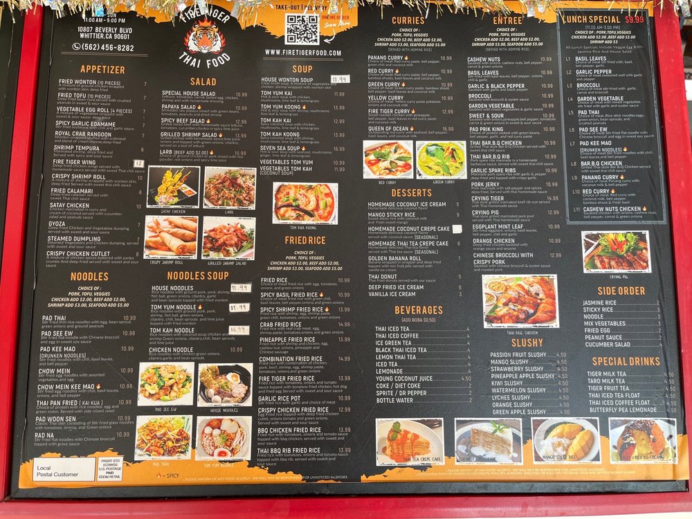 Nestled in Whittier, CA, Fire Tiger Thai Food offers a vibrant menu that captures the essence of traditional Thai cuisine. Each dish is crafted with care, from the classic Pad Thai to the spicy Pad Kee Mao (Drunken Noodles), bringing freshness and flavor to your plate. The pan-fried noodles section showcases a delightful variety, while the wok specialties like Orange Chicken and Garlic & Pepper Sauce reflect homestyle cooking, perfect with jasmine rice.